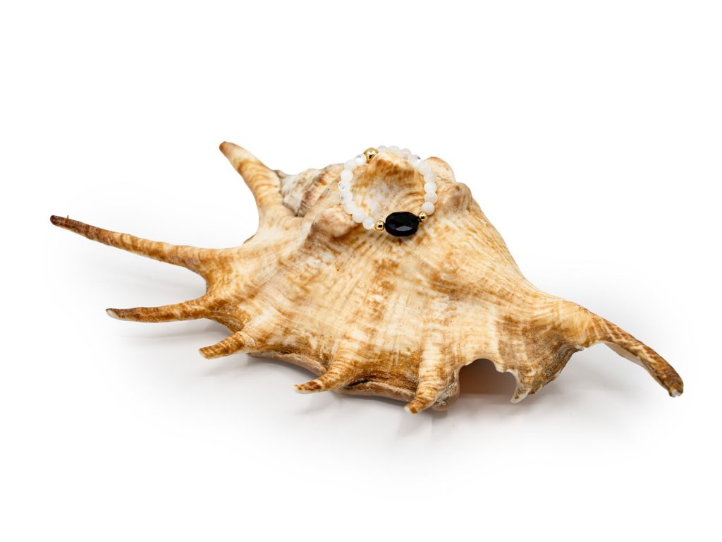 Jemný, ale výrazný prsteň z mesačného kameňa doplnený brúseným čiernym spinelom a pozláteným certifikovaným striebrom AG925. Symbol intuície, ochrany a vnútornej sily.