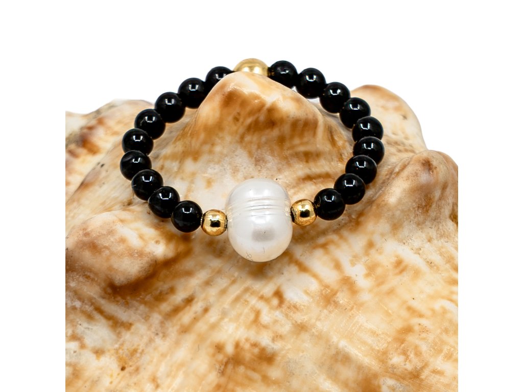 Elegantný minimalistický prsteň z čierneho spinelu doplnený pravou riečnou perlou a pozláteným striebrom. Výrazný kontrast, ktorý podčiarkne ženskosť aj silu.