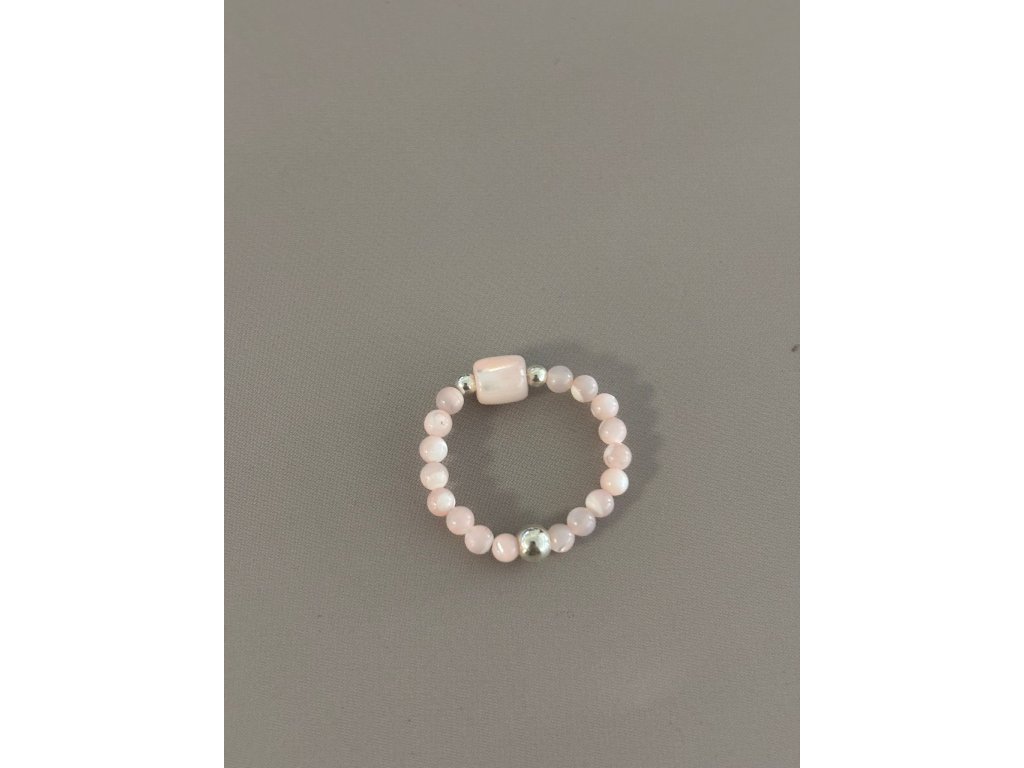 Jemný prsteň zo striebra, ružovej perlete a perleťového valčeka. Ručne vyrábaný kúsok, ktorý spája ženskosť, prirodzený lesk a elegantnú originalitu Wrapie.