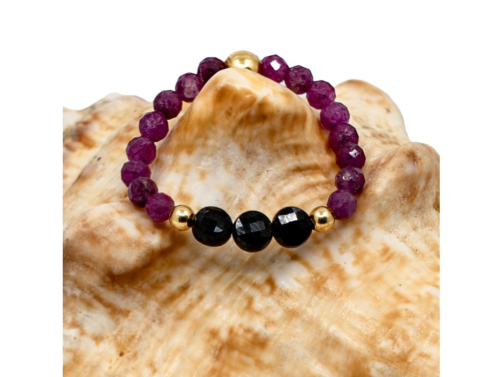Výrazný handmade prsteň z čierneho spinelu, ohnivého rubínu a pozlátených guličiek z pravého certifikovaného striebra AG925. Energia, vášeň a elegancia v jednom.