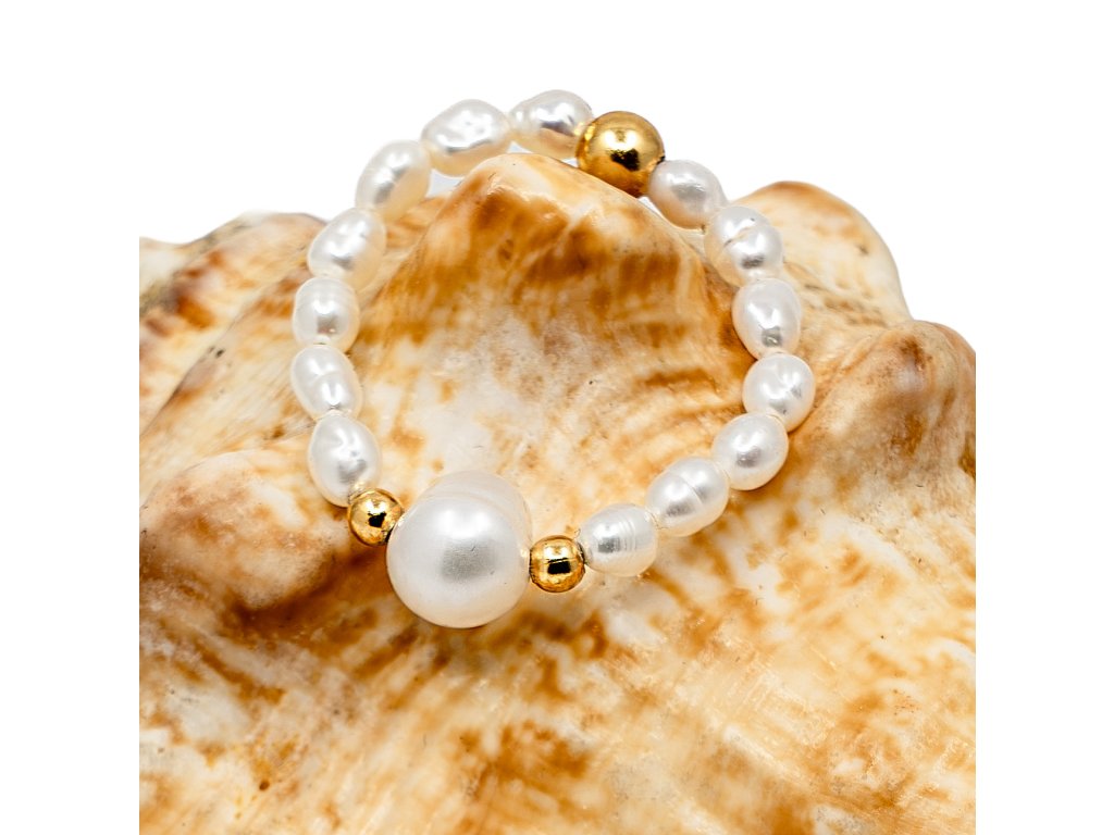 WHITE PEARL QUEEN je elegantný ručne vyrábaný náramok z prírodných riečnych perál s dominantnou centrálnou perlou a zlatými detailmi.